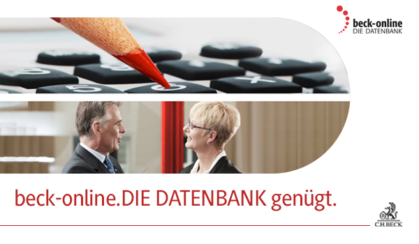 | |  | beck-online.DIE DATENBANK ist das Datenbank-Angebot des Verlags C.H.BECK Rechtliche Gesamtverantwortung: Verlag C.H.Beck GmbH & Co. KG, HRA 48 045, Amtsgericht München Umsatzsteuer-ID DE129734754 Hausanschrift: Wilhelmstr. 9, 80801 München Postanschrift: Postfach 40 03 40, 80703 München Telefon: (089) 3 81 89-0 Telefax: (089) 3 81 89-402 Webseite