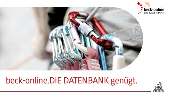 | Unser gesamtes Datenbank-Programm finden Sie auf beck-online.de Impressum Verlag C.H.Beck GmbH & Co. KG, Wilhelmstraße 9, 80801 München, Postanschrift: Postfach 40 03 40, 80703 München Internet: www.beck.de Die Verlag C.H.Beck GmbH & Co. KG mit Sitz in München, Amtsgericht München HRA 48 045, wird vertreten durch die C.H.Beck Verwaltungs GmbH mit Sitz in München, Amtsgericht München HRB 254521, Geschäftsführer: Dr. Klaus Weber, Dr. Jonathan Beck, Dr. Christian Kopp, Dr. Thomas Aichberger, Kilian Steiner, Dr. Roland Klaes. USt.-Ident.-Nr: DE 129 73 47 54 Bei Fragen können Sie sich gerne unter beck-online@beck.de an unseren Kundenservice wenden. Informationen zum Datenschutz: Wir senden Ihnen Informationen über unsere Produkte zu, weil Sie aufgrund einer Werbeeinwilligung, einer Vertragsbeziehung und/oder Ihrer Interessengebiete sowie Ihrer berufl ichen Tätigkeit für die Teilnahme an unserer Mailingaktion in Betracht kommen. Wir verwenden Ihre Daten nur zu diesem Zweck und geben diese Daten nicht an Unternehmen außerhalb der Verlags C.H.BECK Unternehmensgruppe weiter. Die Verwendung der Daten zu Werbezwecken erfolgt durch den Verlag C.H.BECK oder einen zu diesem Zweck beauftragten Dienstleister. Die Daten werden nicht außerhalb der Europäischen Union verarbeitet, es sei denn, die besonderen datenschutzrechtlichen Anforderungen der EU-Datenschutzgrundverordnung werden erfüllt. Die Daten werden im Rahmen der gesetzlichen Aufbewahrungsfristen gespeichert. Sie haben das jederzeitige Recht auf (a) Auskunft über die zu Ihrer Person gespeicherten Daten, (b) Berichtigung unrichtiger Daten, (c) zur Löschung Ihrer Daten sowie (d) die Einschränkung der Verarbeitung. Sie haben das Recht, formlos jederzeit der Verarbeitung mit Wirkung für die Zukunft zu widersprechen. Sie haben das Recht der Beschwerde gegen die Datenverarbeitung bei der für den Verlag C.H.BECK zuständigen Aufsichtsbehörde, dem Landesamt für Datenschutzaufsicht in Bayern. Im datenschutzrechtlichen Sinn verantwortliche Stelle: Verlag C.H.BECK, Wilhelmstr. 9, 80801 München; der Datenschutzbeauftragte ist erreichbar unter datenschutzbeauftragter@beck.de.