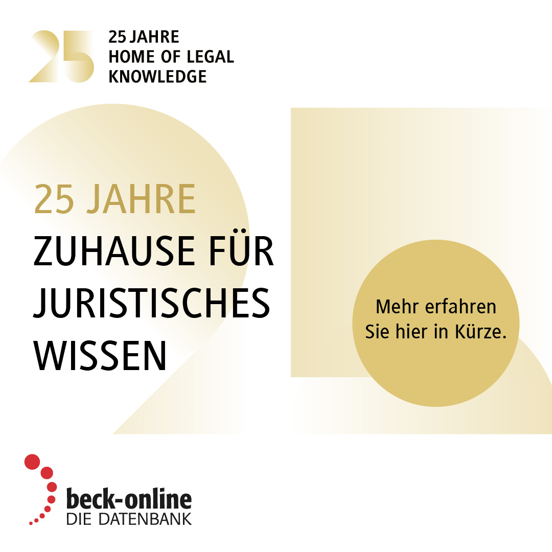 | |  | | | | |  | | 25 Jahre beck-online – unsere Jubiläumsseite |  | beck-online wird 25 Jahre – feiern Sie mit uns! Unter dem Motto »Home of Legal Knowledge« erwarten Sie das ganze Jahr über neue Inhalte, innovative Funktionen, tolle Aktionen und spannende Einblicke. Damit Sie nichts verpassen, wird unsere neue Jubiläumsseite kontinuierlich aktualisiert. Natürlich geben wir hier auch einen Einblick in unsere vielfältige Modulwelt, die seit 25 Jahren stetig wächst und sich weiterentwickelt. Ein Besuch auf beck-online.de lohnt sich damit – gerade im Jubiläumsjahr mehr denn je!